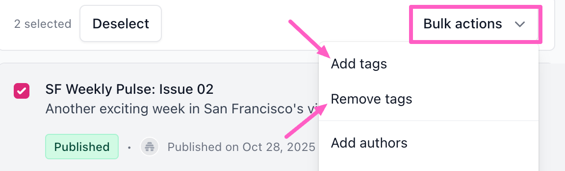 Pro Tip: You can edit content tags in bulk by navigating to the posts page > select the posts you want to manage > Bulk actions > Add tags or Remove tags.