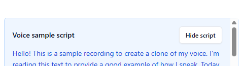 Once your recording has begun, you can start speaking. For best results, speak in a quiet environment for 1-2 minutes. You’ll be provided with a timer to show you how long you have been recording, as well as a sample script that you can read from for your recording.
