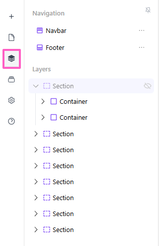 The Layers & Navigation tab is located in the Icons menu (the toolbar on the left). From here, you can also access your Navbar and Footer settings.